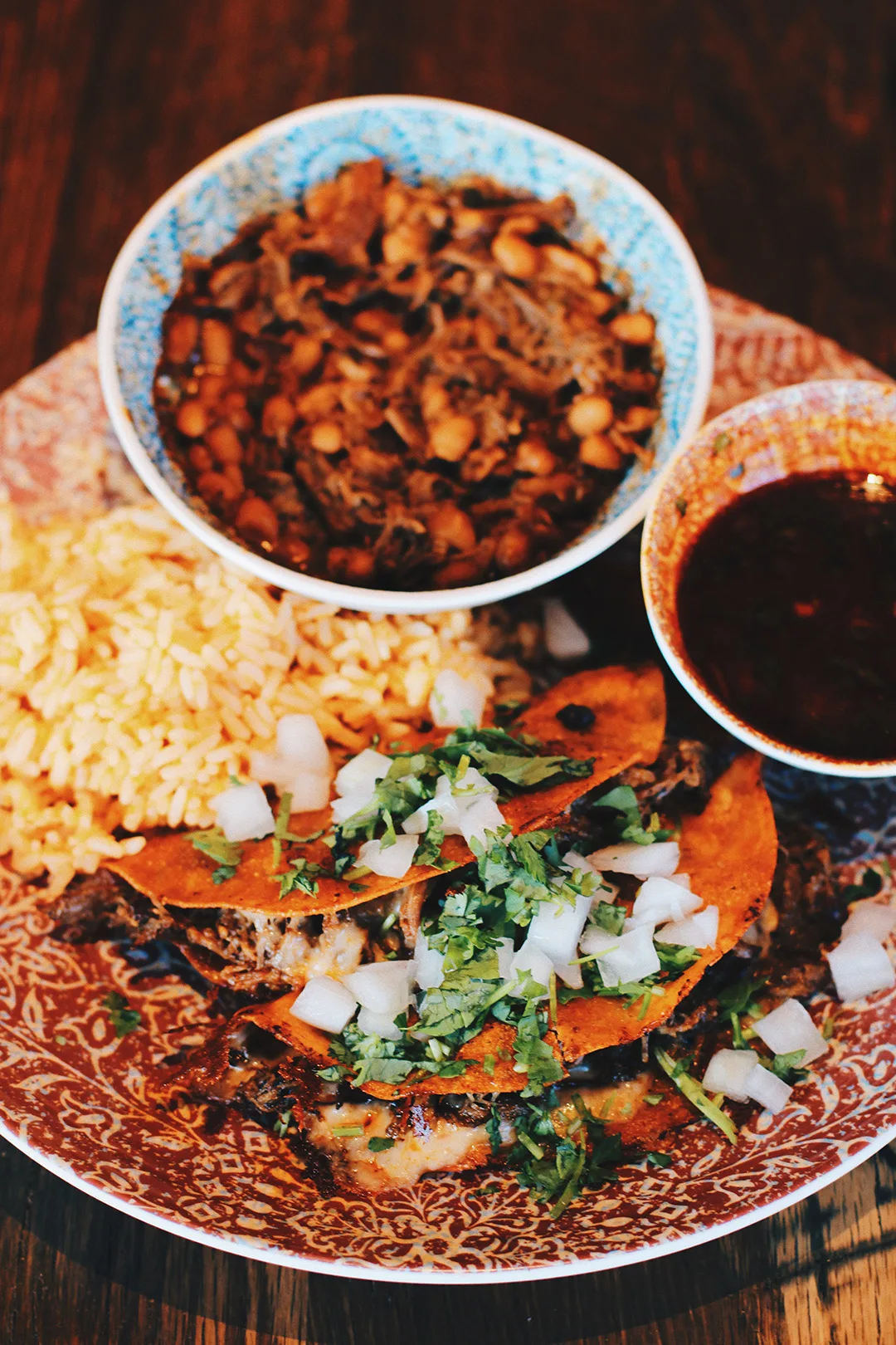 Homemade birria and Chihuahua cheese in corn tortillas baked to a slight crisp. Served with consommé, birria baked beans and rice.